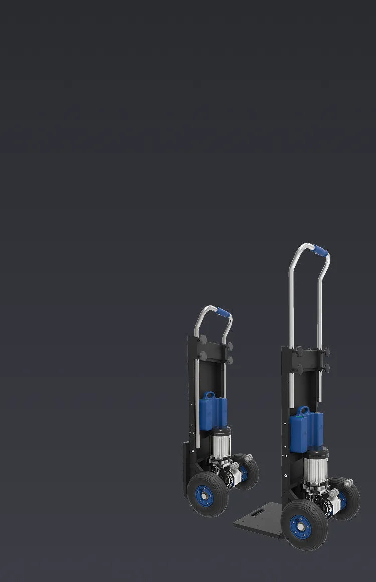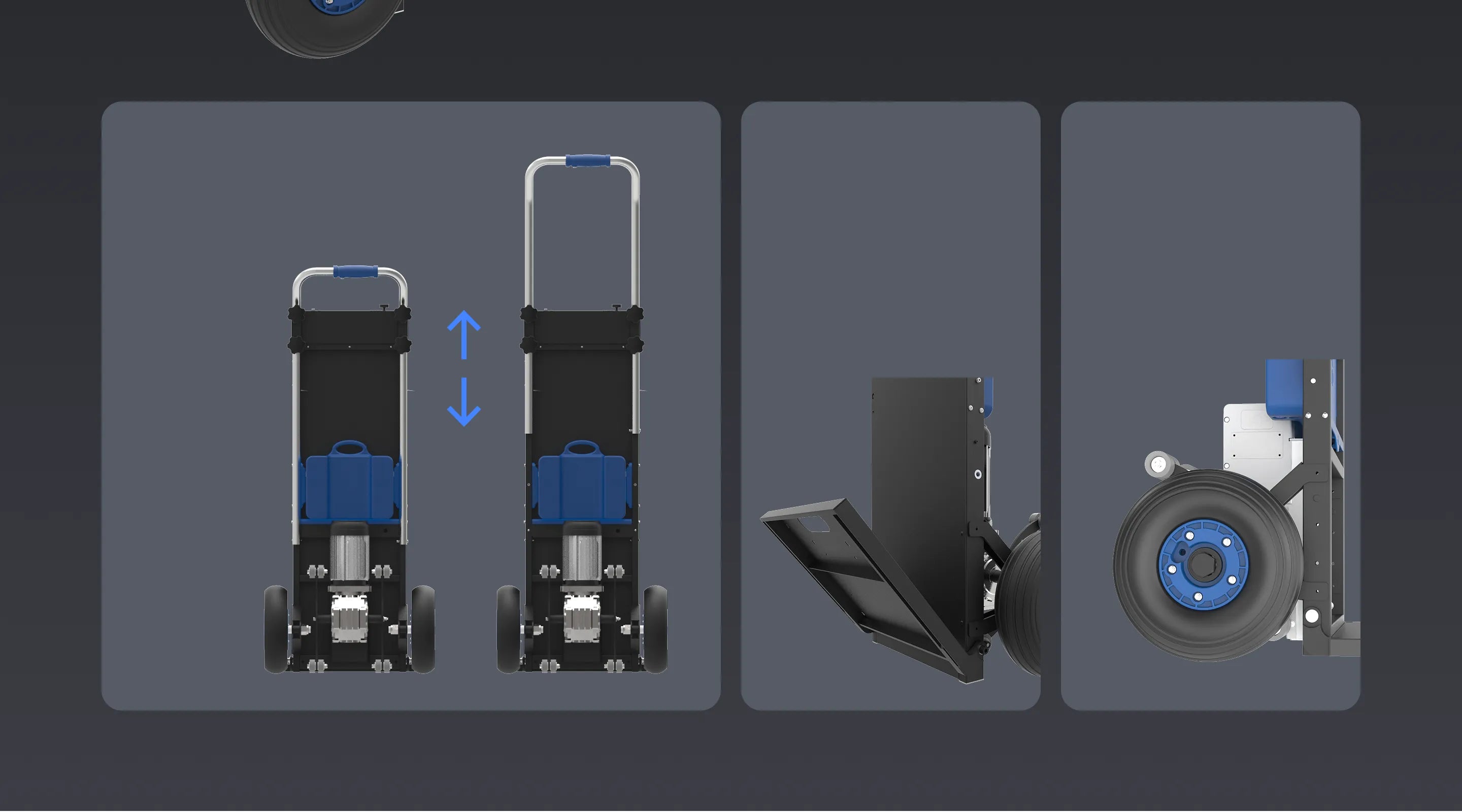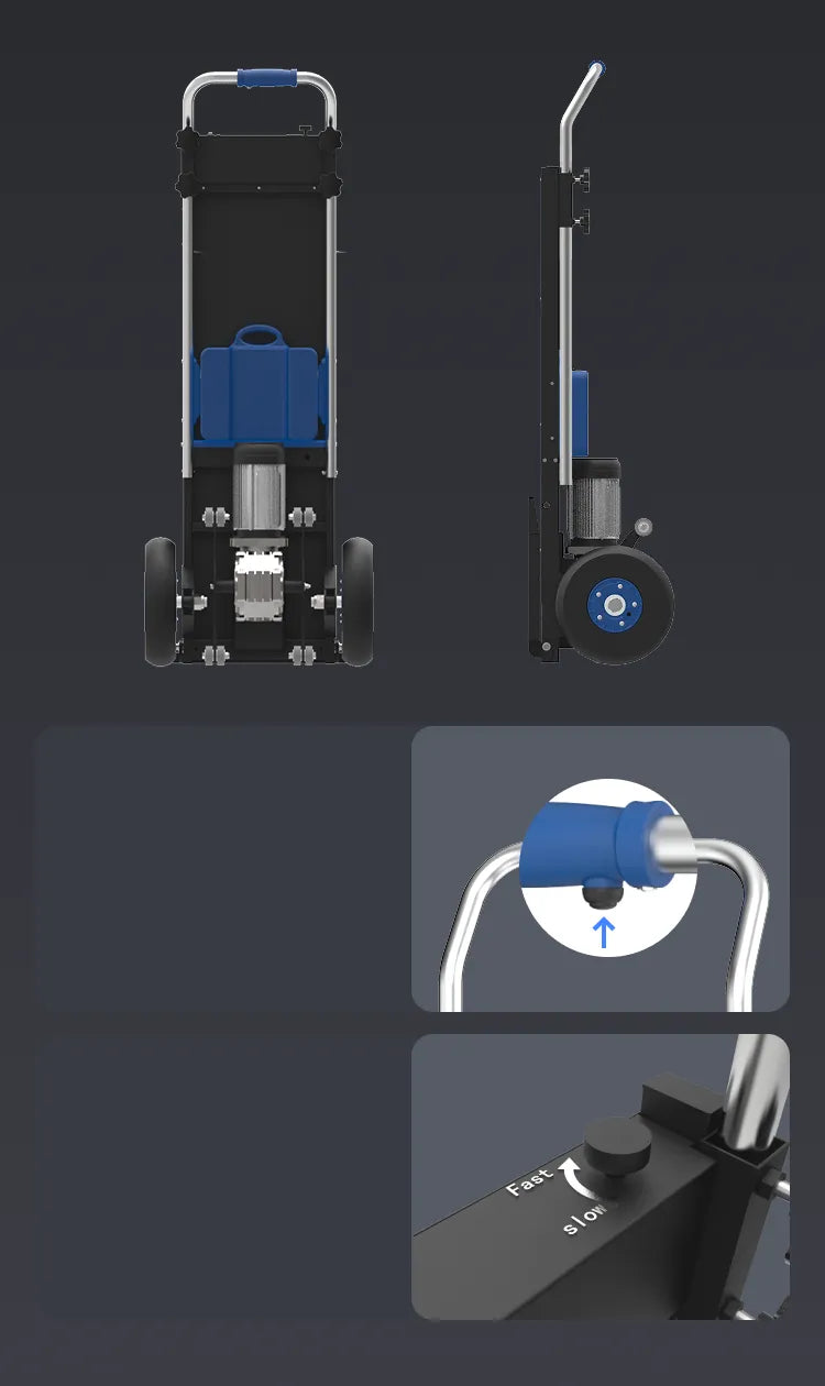 ZW4250 is a foldable and carbon‑steel powered stair climber (550 lbs/250 kg), with self-developed electric drive assembly.