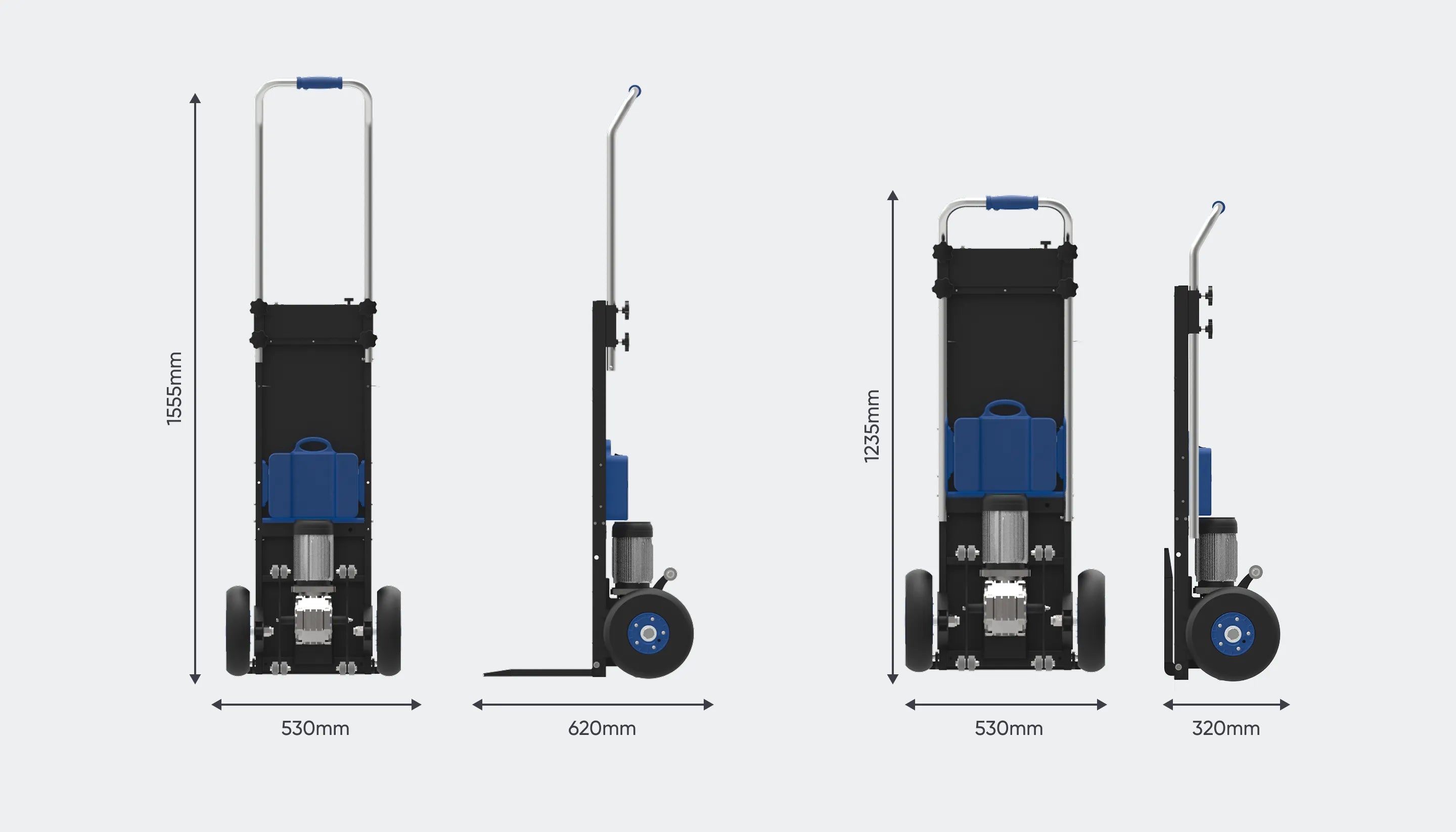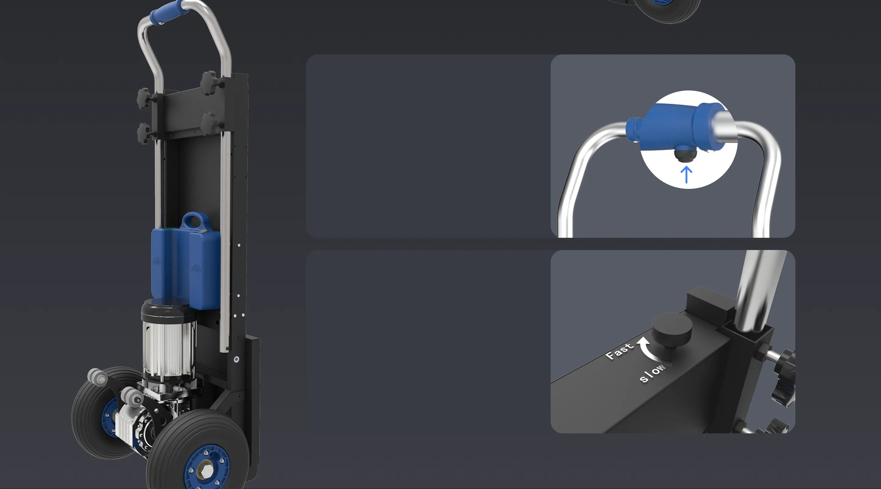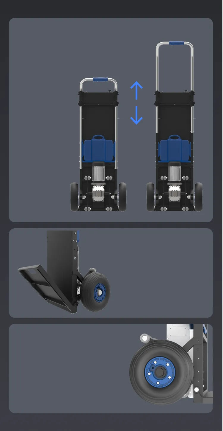 ZW4250 is a foldable and carbon‑steel powered stair climber (550 lbs/250 kg), with self-developed electric drive assembly.